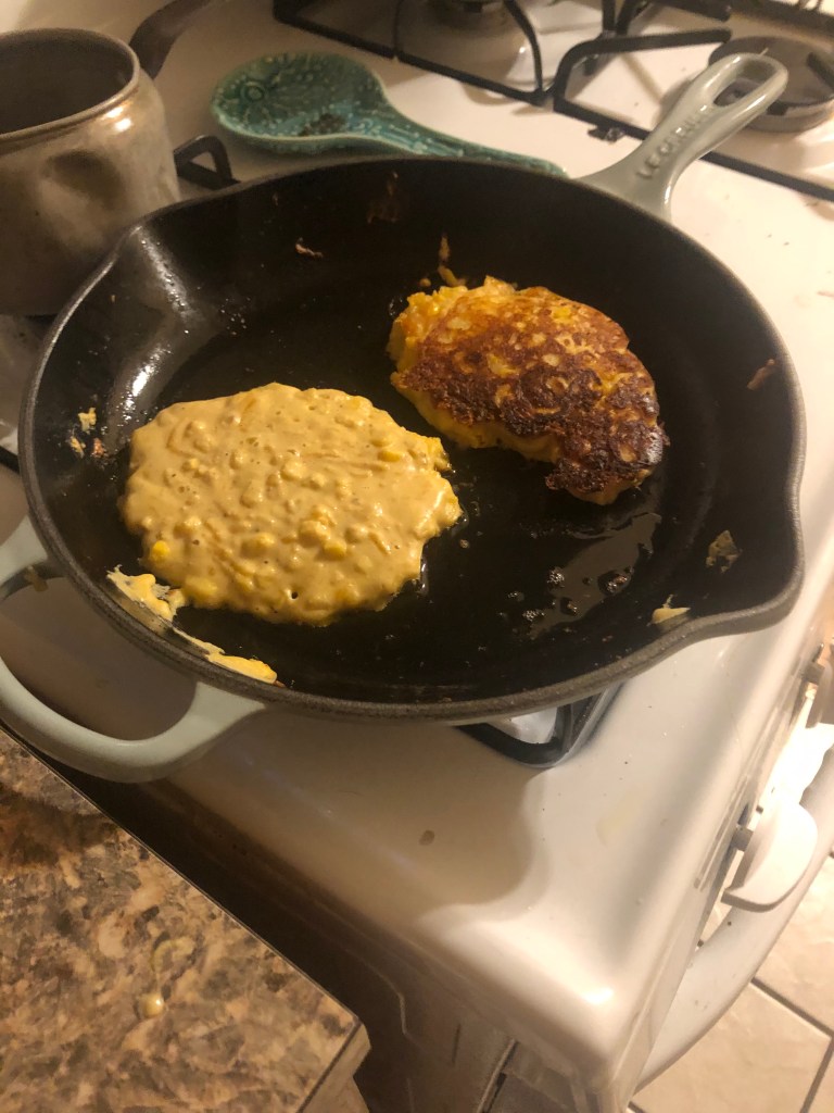 SO this definitely had pancake vibes over fritters. The amount of baking powder made the dough really fluffy and pancake-like. There wasn’t enough corn: there was about 2 cups of corn out of the can. I had a mini can of corn I could have opened, but I thought maybe the amount I had would be enough– it wasn’t. The pancakes were good, but not what I was trying to make. The final product wasn’t something you could just have on it’s own. I made my go-to avocado spread & egg topping and it was very delicious. I realized that the scallions would prob be bomb in them & I def needed more corn. Also, I wasn’t a fan of the flour combo I used. They were too thick, so my next attempt’s main goal would be to fix the consistency.